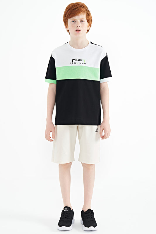 Black Collar Color Block Print Detailed Standard Cut Boys T-Shirt - 11111