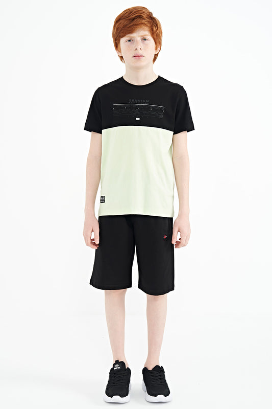 Light Green Printed Color Block Standard Fit O Collar Boys' T-Shirt - 11134