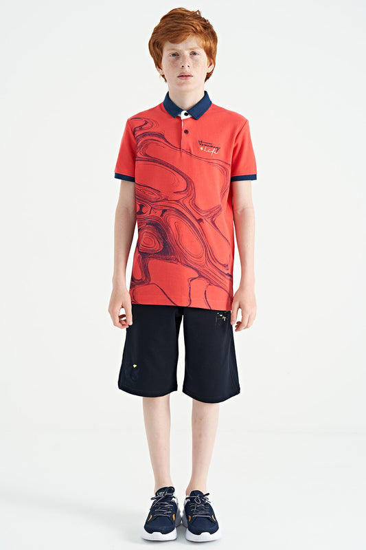 Coral Print Detailed Standard Mold Polo Collar Boys T-Shirt - 11165