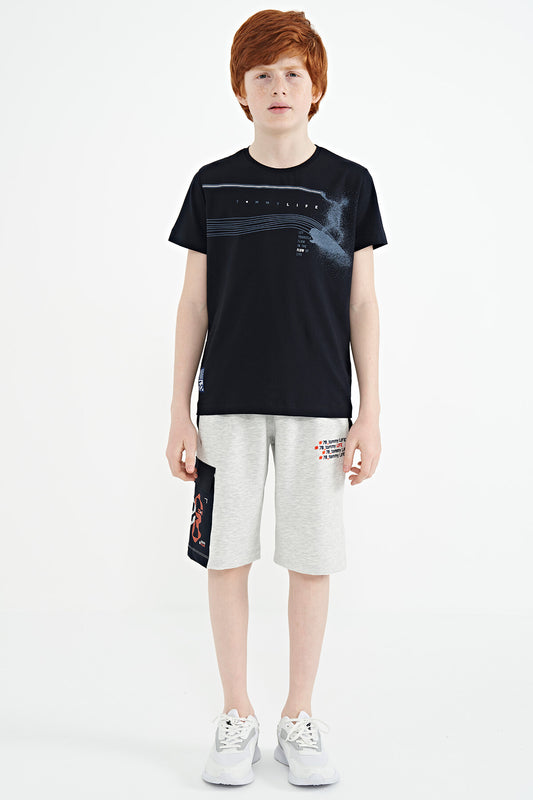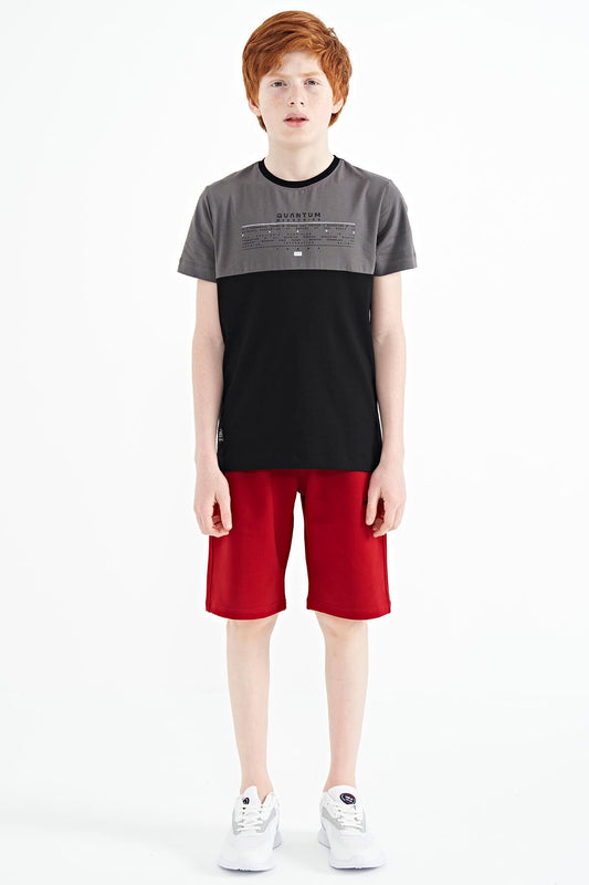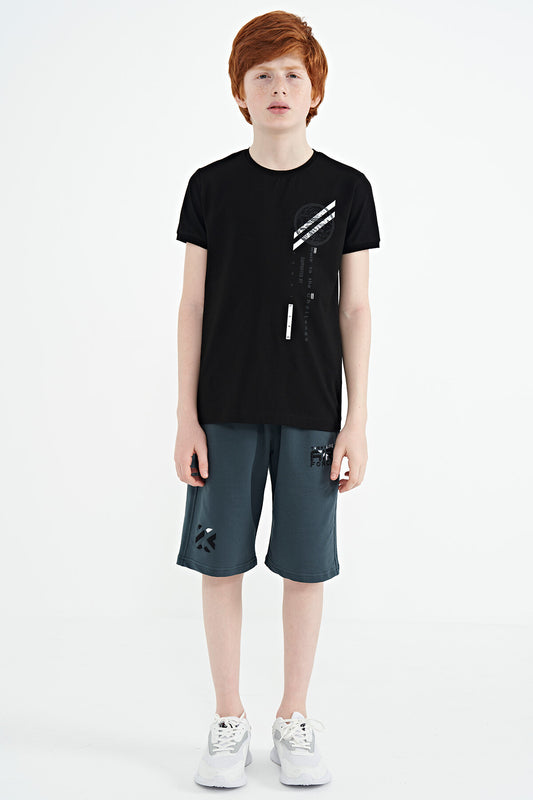 Black Print Detailed O Collar Standard Fit Boys' T-Shirt - 11131