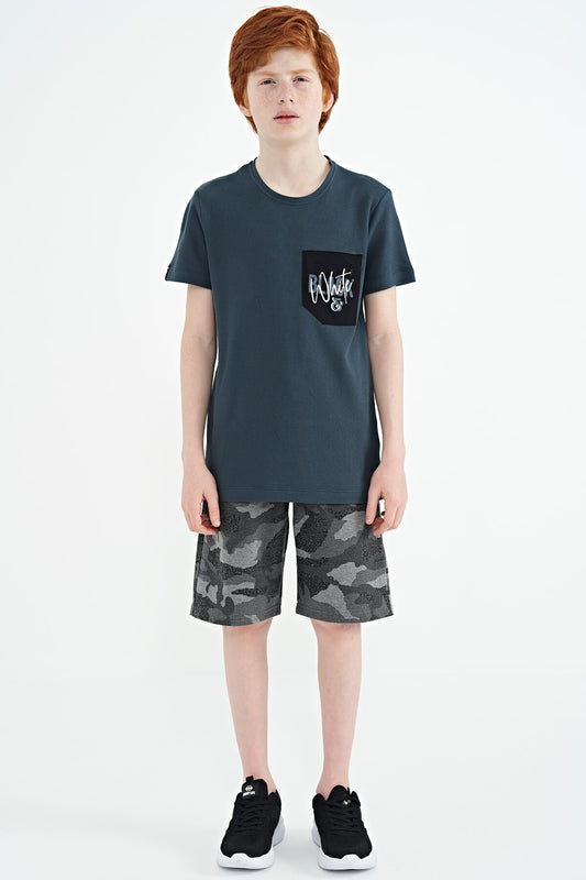Forest Green Front Pocket Embroidered O Collar Standard Fit Boys' T-Shirt - 11116
