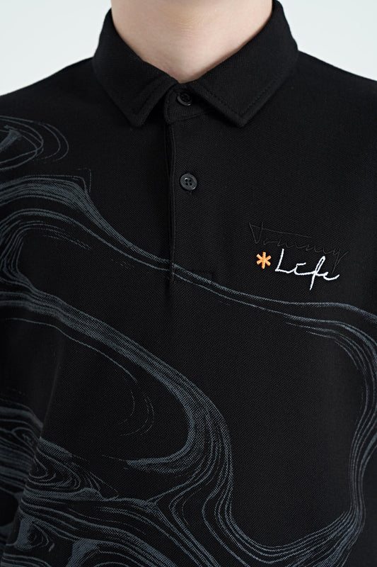 Black Print Detailed Standard Mold Polo Collar Boys T-Shirt - 11165