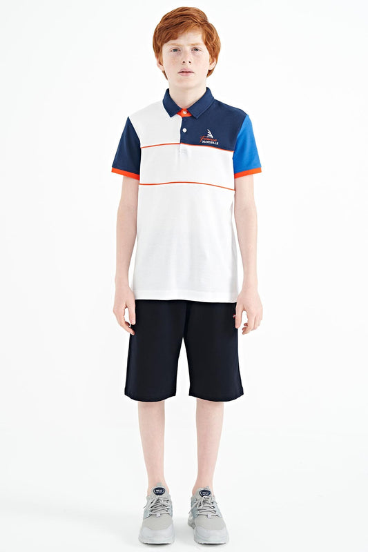 White Color Block Embroidered Letter Detailed Standard Pattern Polo Collar Boys T-Shirt - 11109