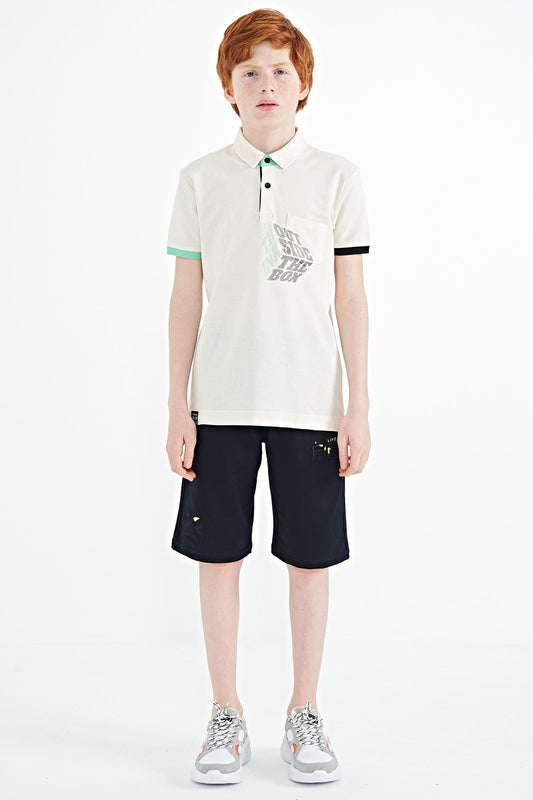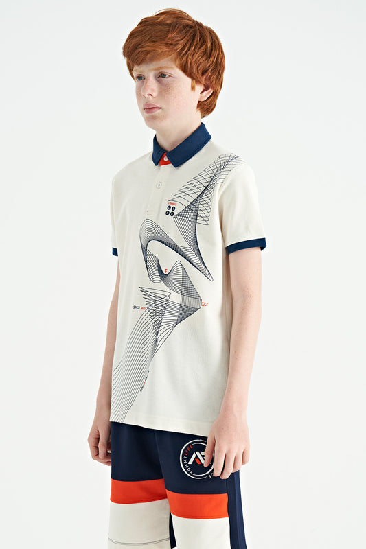 Ecru Front Detailed Printed Standard Fit Polo Collar Boys' T-Shirt - 11102