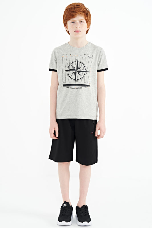 Grey Melange Compass Print Standard Fit O Neck Boys T-Shirt - 11106