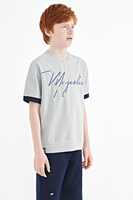 Grey Front Print Embroidered O Collar Oversize Boys T-Shirt - 11147