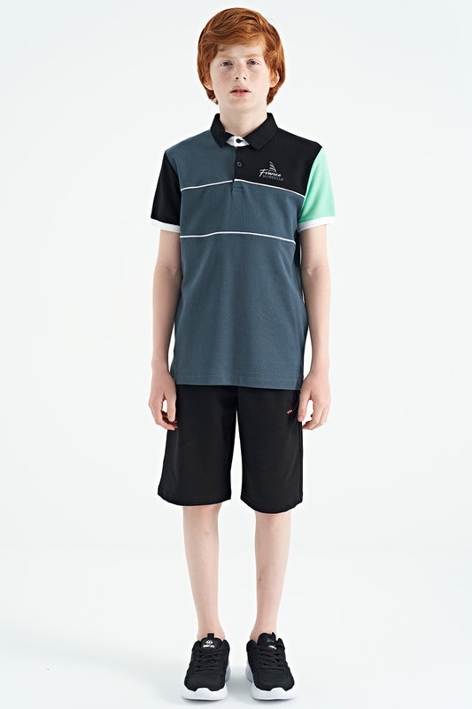 Forest Green Color Block Embroidered Letter Detailed Standard Pattern Polo Collar Boys T-Shirt - 11109