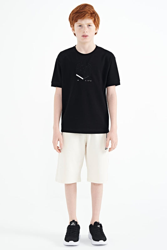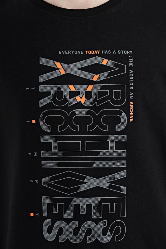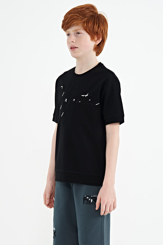Black Pre-Print Detailed O Collar Standard Fit Boys T-Shirt - 11099