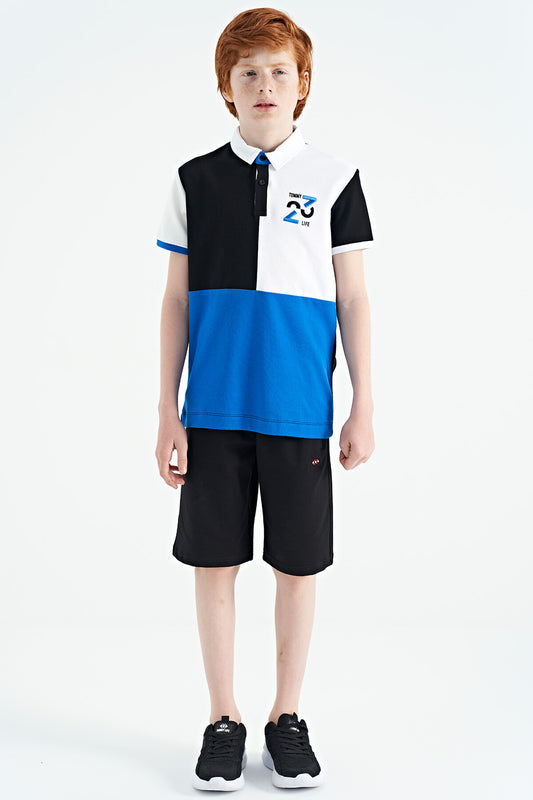 Detailed Standard Pattern Embroidered Color Block Polo Collar Boys' T-Shirt - 11108