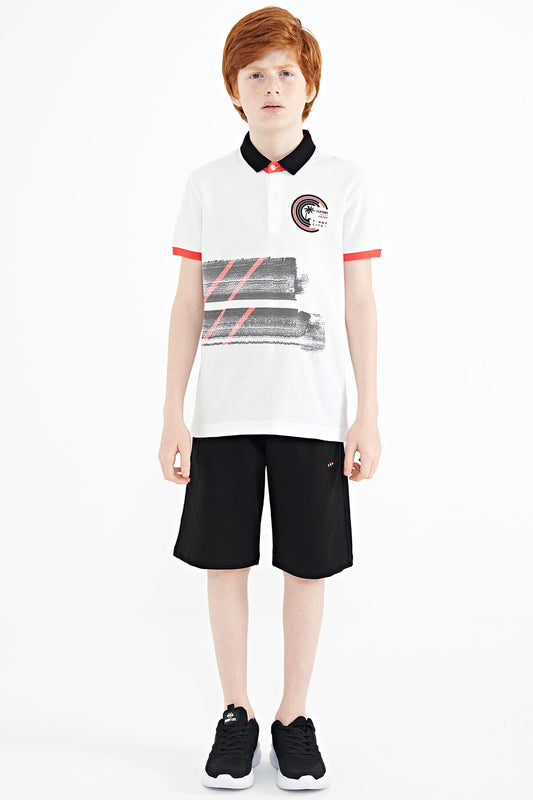 White Print Detailed Polo Collar Standard Fit Boys' T-Shirt - 11094