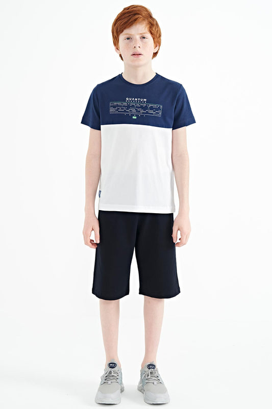 Indigo Shoulder Print Detailed Standard Model O Collar Boys T-Shirt - 11121