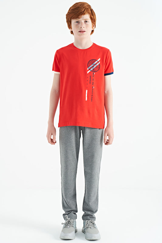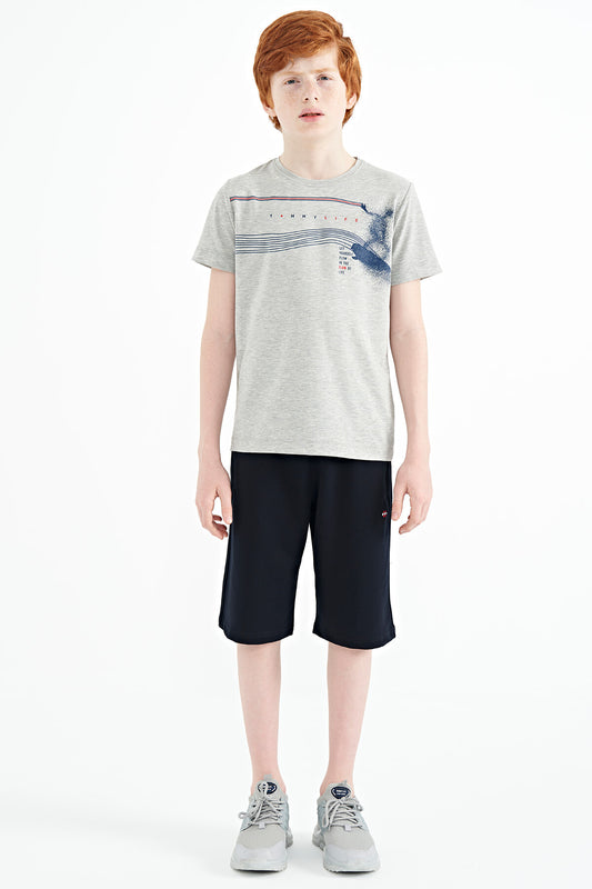 Grey Melange Print Detailed Standard Mold O Collar Boys T-Shirt - 11133