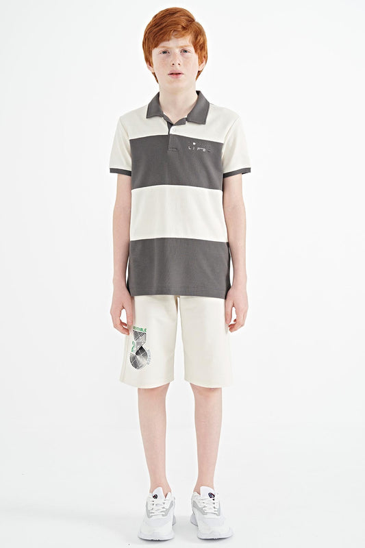 Dark Grey Color Block Letter Embroidered Standard Fit Polo Collar Boys' T-Shirt - 11095