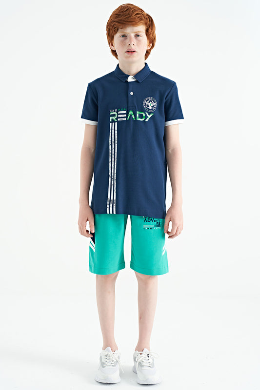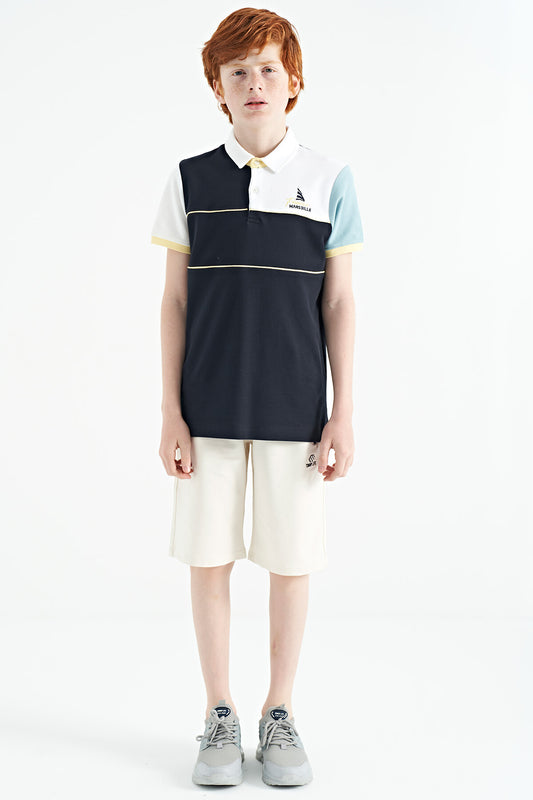 Navy Blue Block Embroidery Letter Detailed Standard Template Polo Collar Boys T-Shirt - 11109