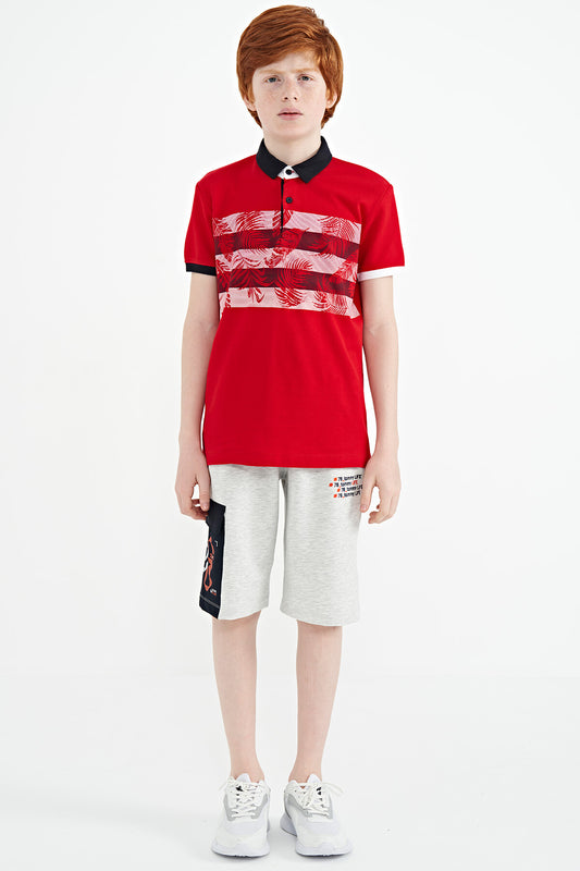 Red Print Detailed Standard Cut Polo Collar Boys T-Shirt - 11101