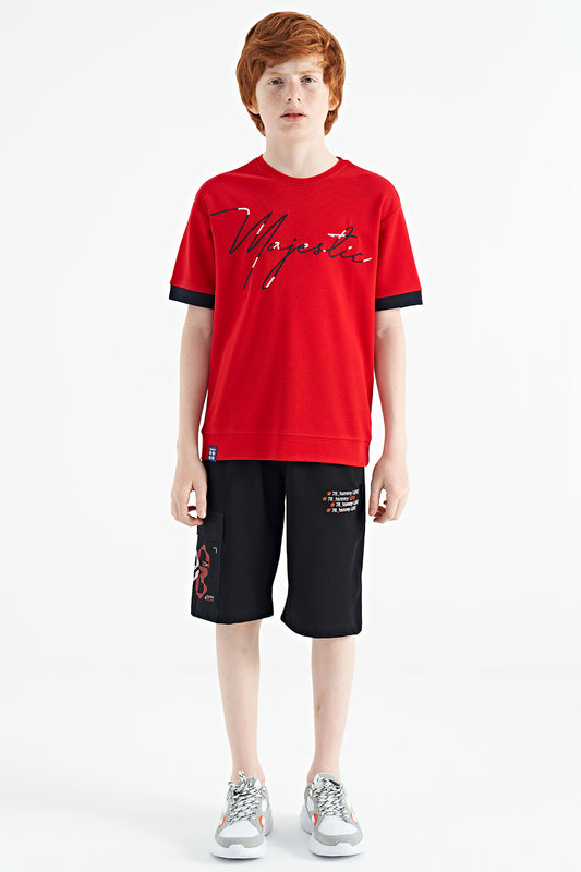 Red Embroidered Detailed O Collar Standard Fit Boys' T-Shirt - 11115
