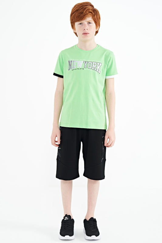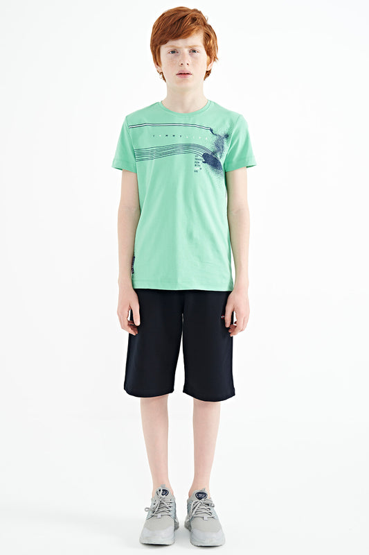 Mint Green Print Detailed Standard Mold O Collar Boys T-Shirt - 11133