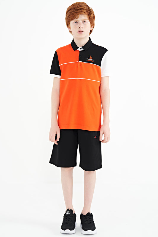 Orange Color Block Embroidered Letter Detailed Standard Pattern Polo Collar Boys T-Shirt - 11109