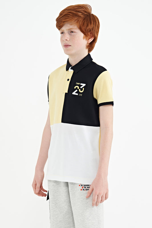 Detailed Standard Pattern Embroidered Yellow Block Polo Collar Boys' T-Shirt - 11108