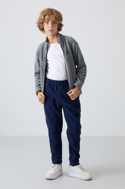 Navy Blue Thick Soft Textured Standard Fit Embroidered Fleece Boys' Tracksuit Bottom - 11220