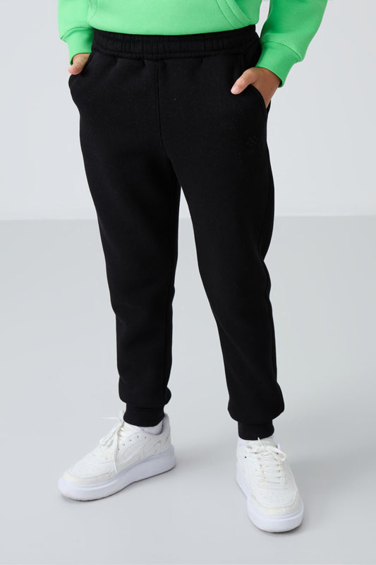 Black Thick Soft Textured Standard Fit Embroidered Fleece Boys' Tracksuit Bottom - 11220