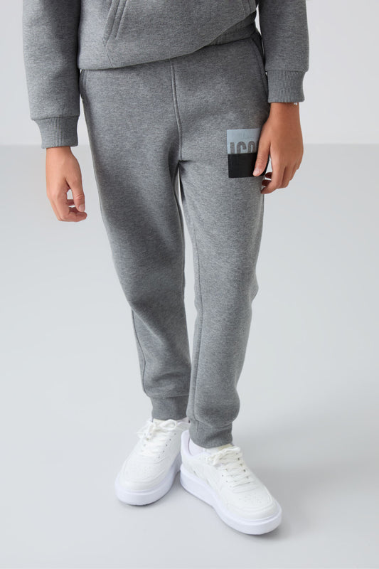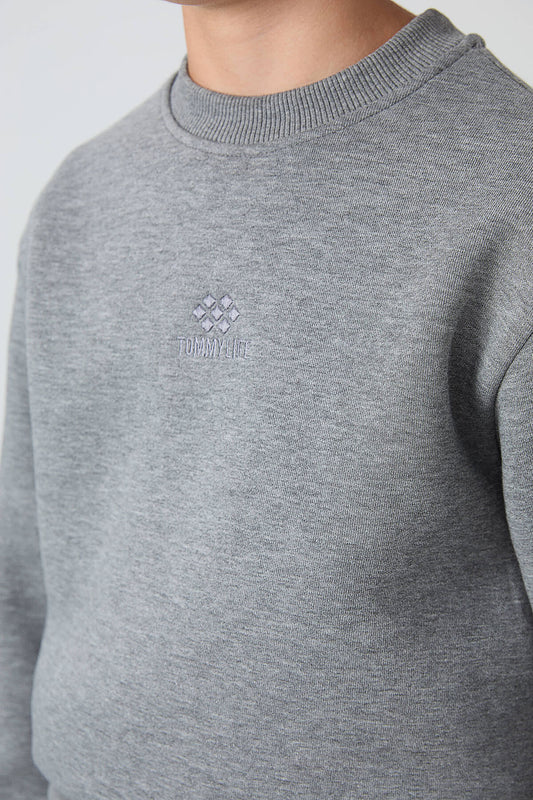 Grey Melange Thick Soft Textured Standard Fit Embroidered Fleece Boys' Tracksuit Set - 11218