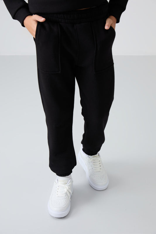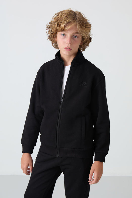 Black Cotton Thick Fleece-Lined Soft Textured Standard Fit Embroidered Boys' Tracksuit Set - 11255