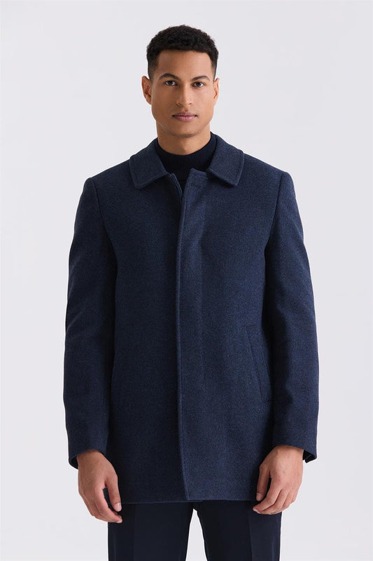 Navy Slim Fit Flat Collar Fish Backed Sports Jacket With Patterned Wool