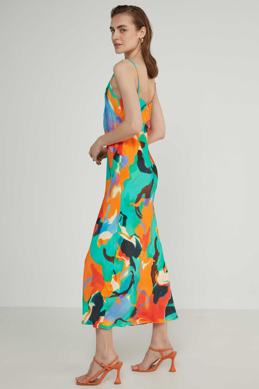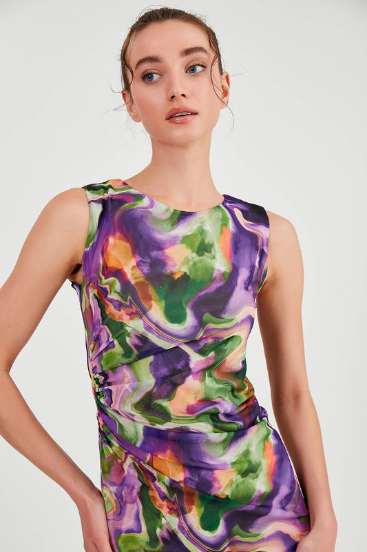 COLORFUL PATTERNED SIDE RUCKLED LONG DRESS
