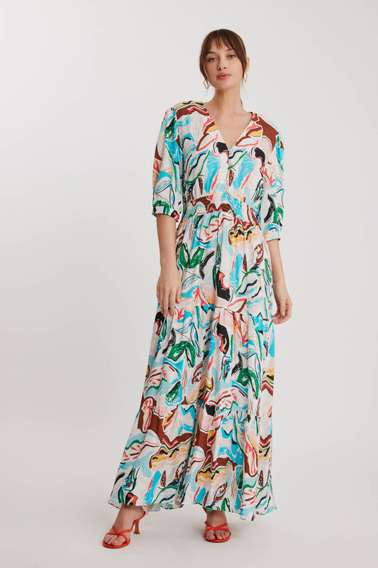 LONG DRESS WITH V COLLAR FRONT BUTTON PATTERN