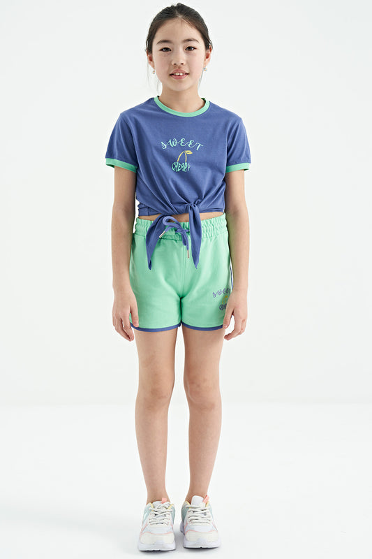 Light Purple - Aqua Green O Collar Printed Knot Detailed Relax Fit Girls' Shorts Set - 75132