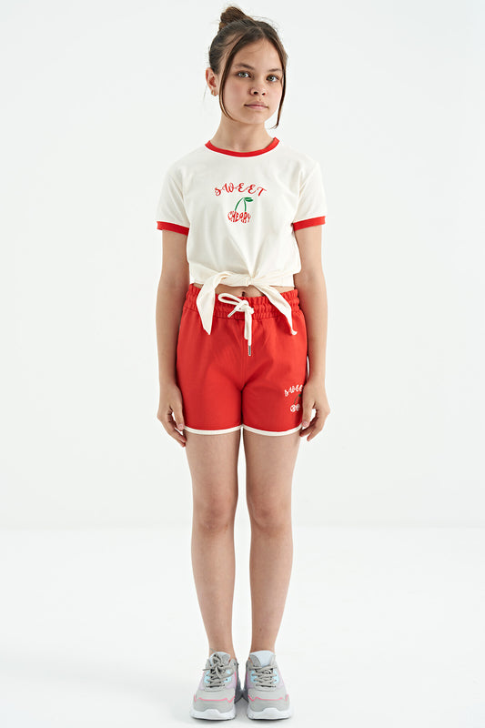 Ecru - Fiesta O Collar Printed Knot Detailed Relax Fit Girls' Shorts Set - 75132
