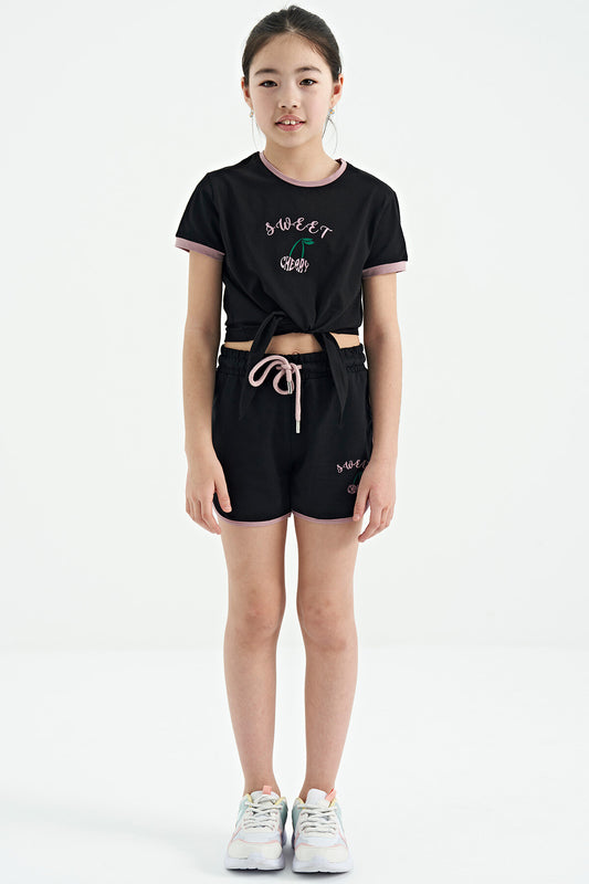 Black O Collar Printed Knot Detailed Relax Fit Girl's Shorts Set - 75132