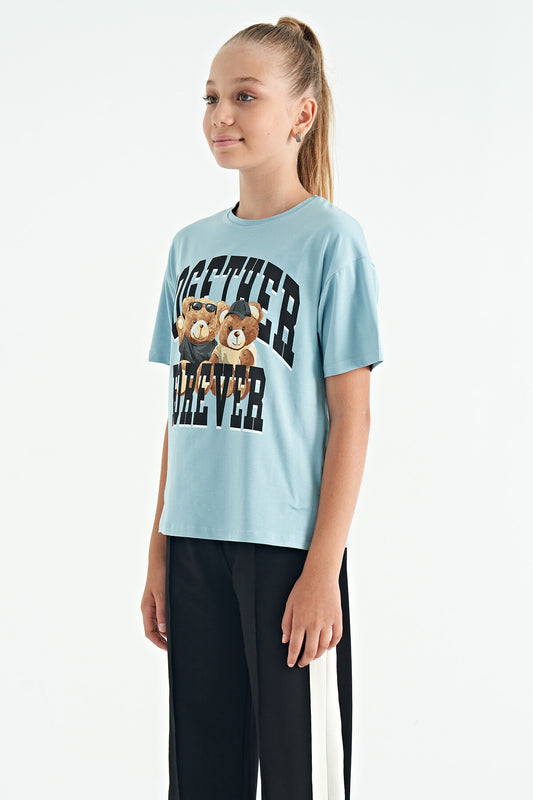 Light Blue Teddy Bear Print O Collar Oversize Short Sleeve Girls' T-Shirt - 75116