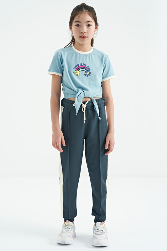 Light Blue Print Detailed O Collar Multicolor Tie Detailed Girl's T-Shirt - 75113