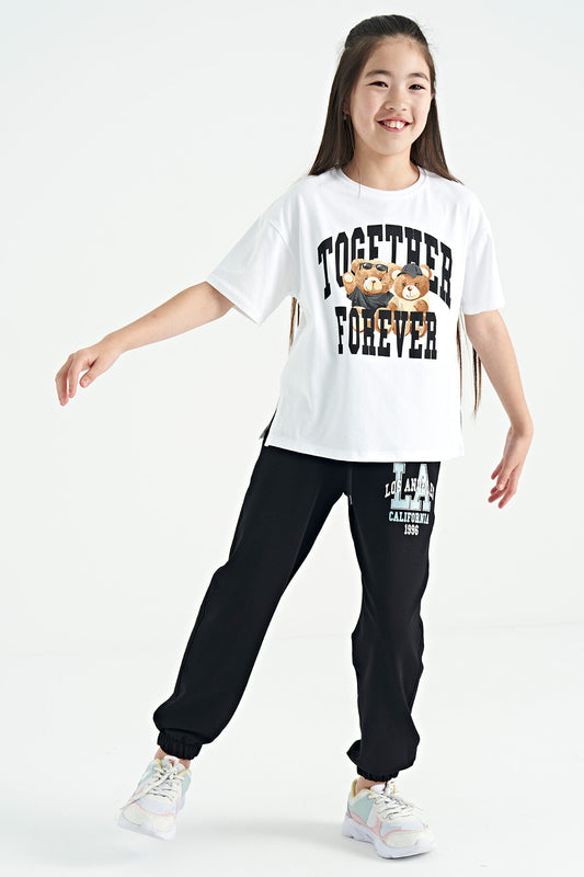 White Print O Collar Low Shoulder Oversize Girl's T-Shirt - 75130