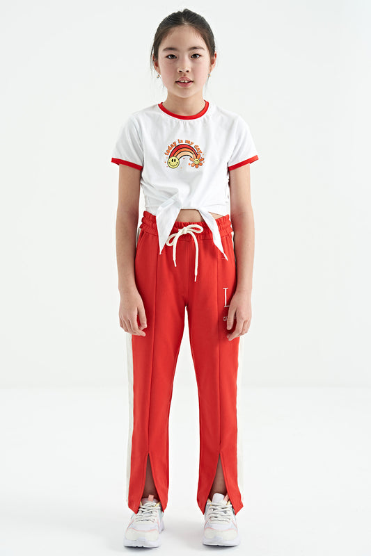 White Print Detailed O Collar Multi-Colored Tie Detailed Girl's T-Shirt - 75113