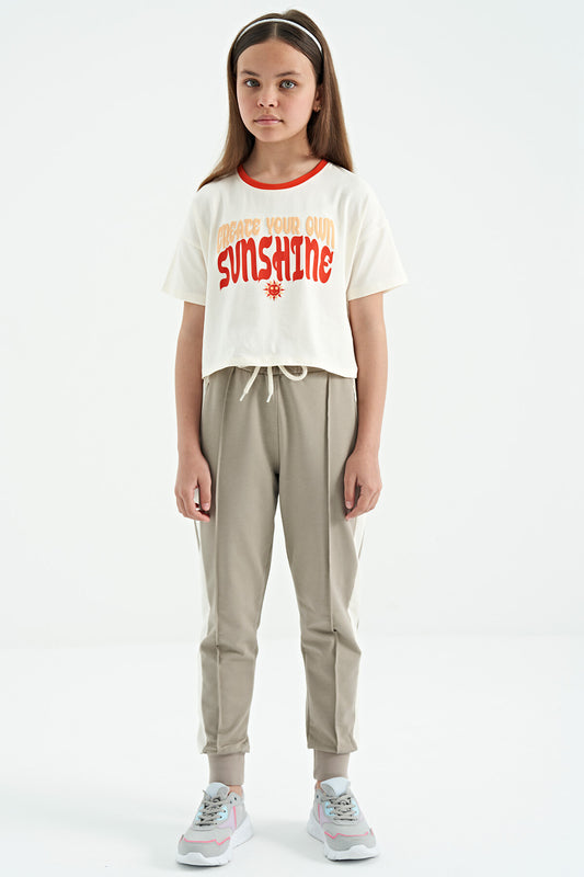 Ecru Color Printed O Collar Oversize Short Sleeve Girls' T-Shirt - 75111