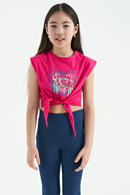 Fuchsia Heart Print Front Knot Detailed Comfortable Fit Girl's T-Shirt - 75114