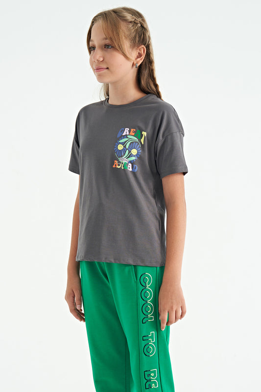 Dark Grey Front Back Multi-Colored Printed Oversize Short Sleeve Girl's T-Shirt - 75117