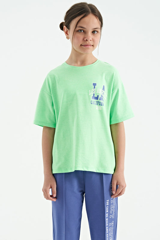 Neon Green Front Back Print O Collar Oversize Short Sleeve Girls T-Shirt - 75127