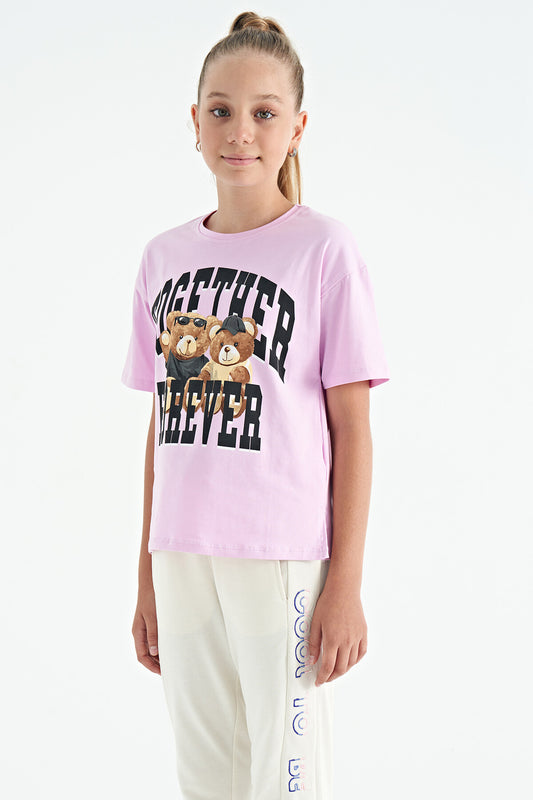Light Purple Printed O Collar Oversize Short Sleeve Girls T-Shirt - 75112