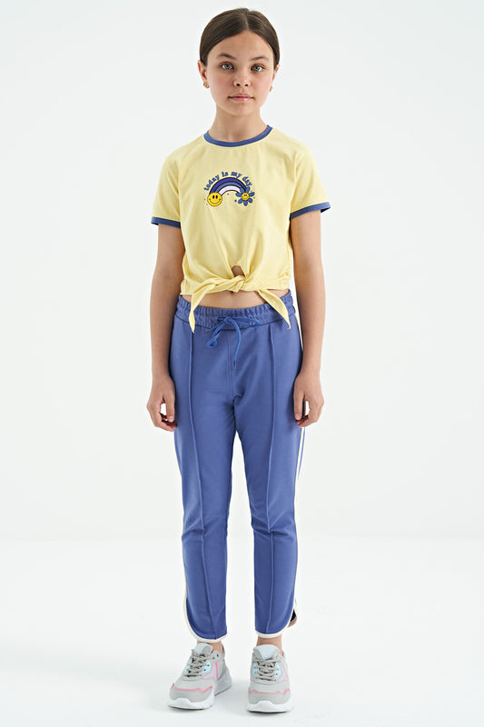 Detailed Print Yellow O-Neck Multi-Colored Tie-Detail Girl's T-Shirt - 75113