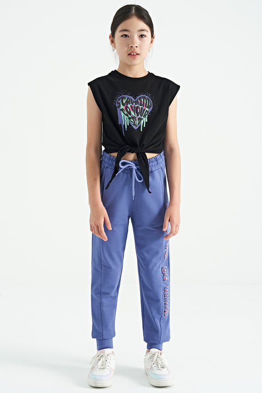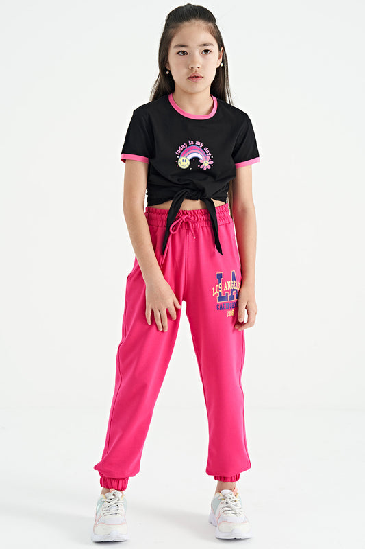 Black Heart Print Front Knot Detailed Comfortable Fit Girls' T-Shirt - 75114