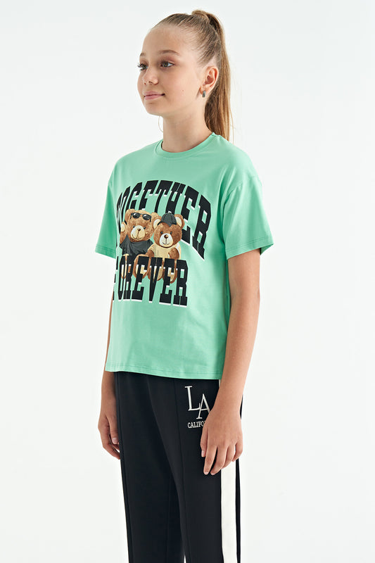 Green Bear Print O Collar Oversize Short Sleeve Girls' T-Shirt - 75116