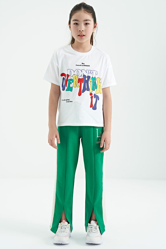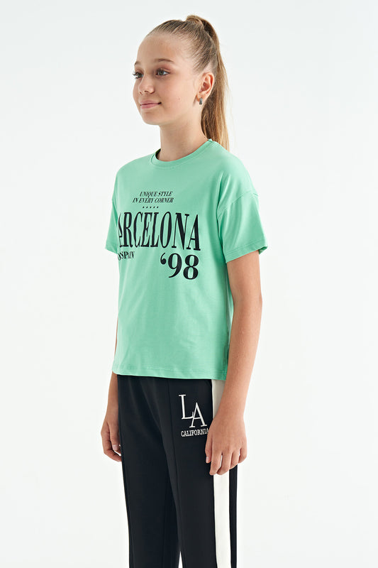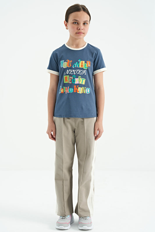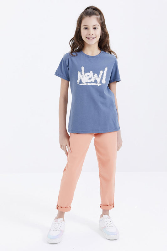 Petrol Colored Writing Detailed O Collar Comfort Fit Girls T-Shirt - 75109