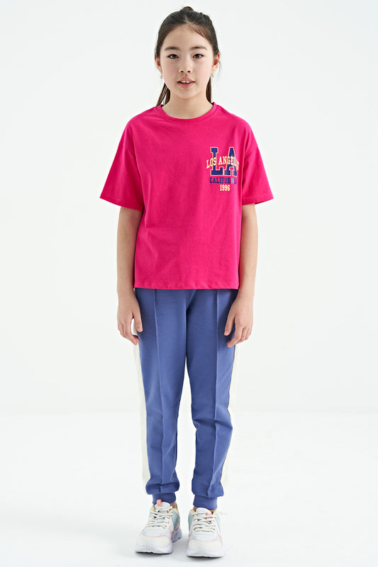 Fuchsia Front Back Printed O Collar Oversize Short Sleeve Girls' T-Shirt - 75127