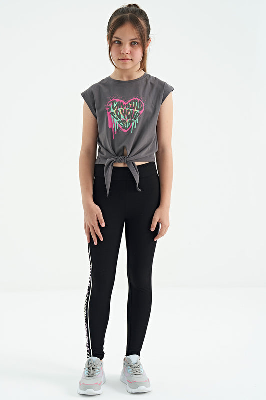 Dark Grey Heart Print Front Knot Detailed Comfortable Fit Girls' T-Shirt - 75114