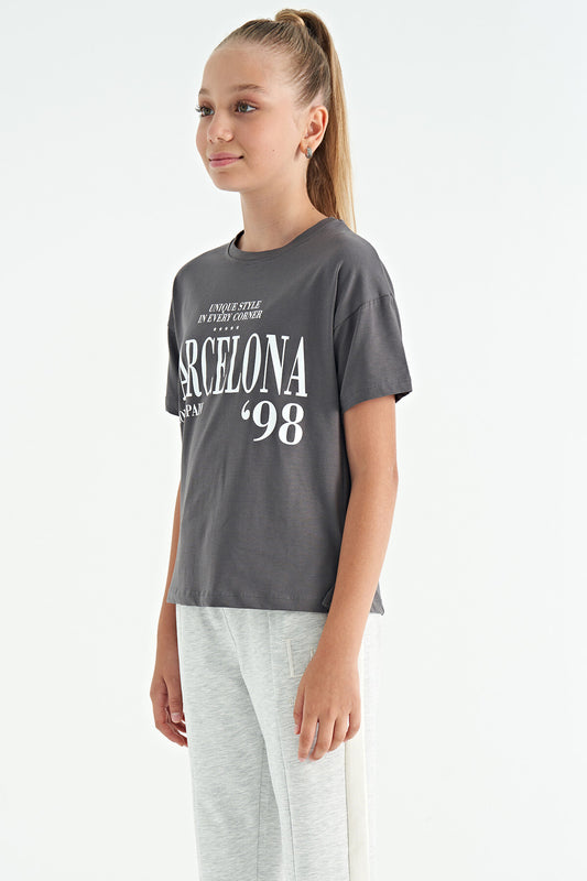 Dark Gray O Collar Printed Drop Shoulder Oversize Girl's T-Shirt - 75115