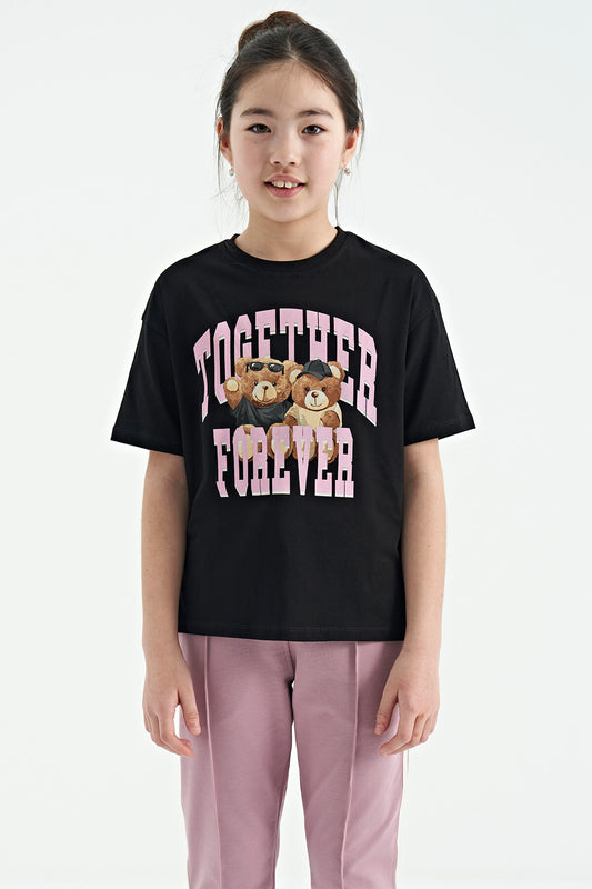 Black Teddy Bear Print O Collar Oversize Short Sleeve Girls T-Shirt - 75116